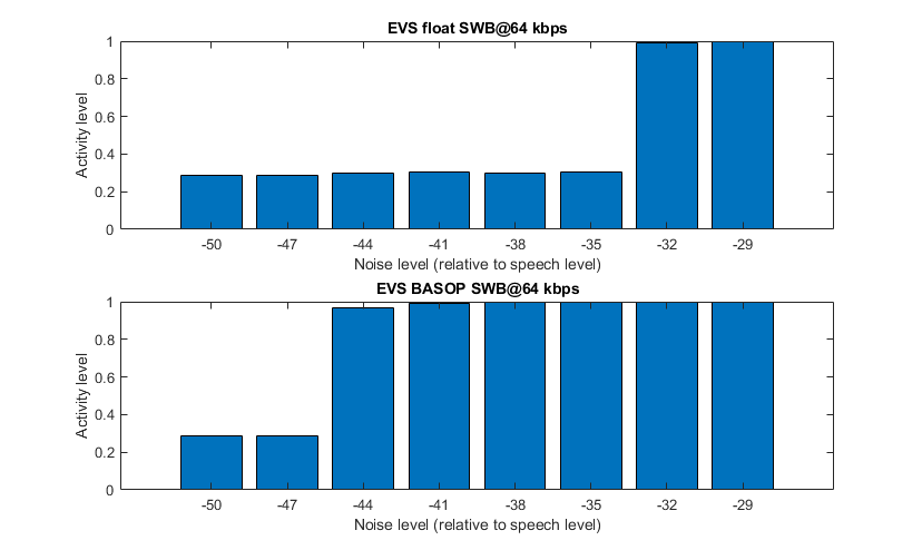 The EVS BASOP has a more conservative behaviour than float. In a 2 minute test signal consisting of a repeated speech utterance with pink noise at different relative speech levels added, this is the activity obtained for BASOP and float: