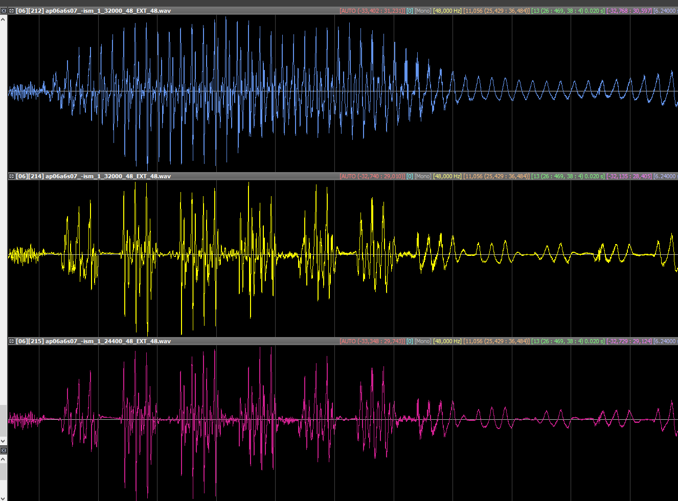 This issue has been first found using -force ACELP, but for the files showed below, it used normal command line (but likely the codec is choosing itself the ACELP part)