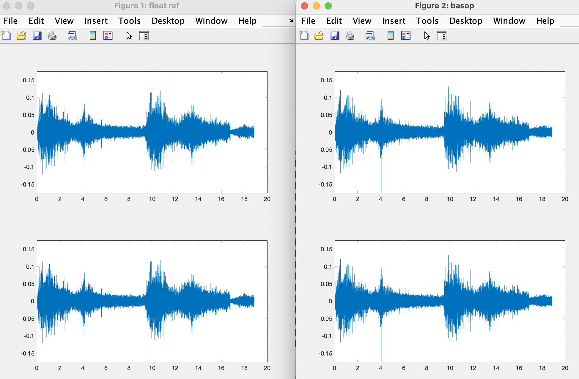 There is an audible and visible "spike" in BASOP encoded signal (at 4 s shown below) using the provided input and command line. There is a transient also in pure float version but it is significantly emphasized with BASOP encoder.