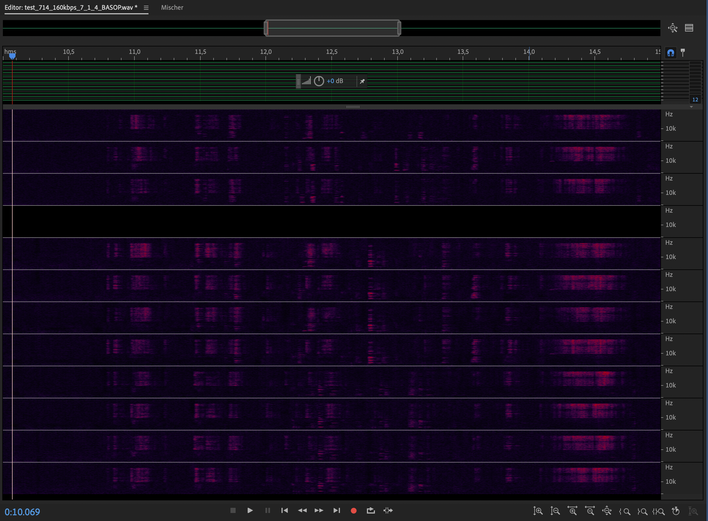 The binaural rendering output for the 7.1+4 decoder introduces relatively large differences, especially at 12.0 - 12.5s. These are not visible when decoding to 7.1+4.