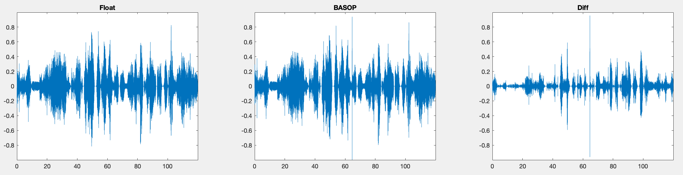 There seems to a bit high MLD of 23.8 (scaling level of input could affect this) and a spike time domain plot of the command line. BASOP is in the spike position audibly louder.