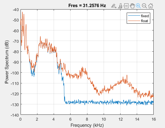 Following is the spectrum plot of the channel 1 of the fixed-point and the floating-point outputs between 4-4.5s It's observed that the fixed-point output cut off sharply above somewhere around 5.5kHz.